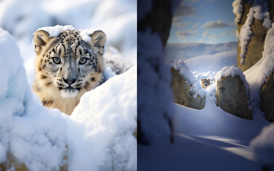 an ice shelf on a cliff, in the style of nature-inspired camouflage, firecore, snow leopard hiding under snow, wildlife photography, 32k uhd, dogon art, macro zoom, joyful celebration of nature --ar 4:5