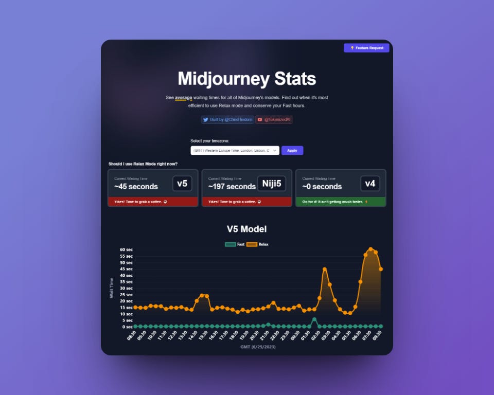 Midjourney Stats,查看所有模型平均等待时间,了解何时使用 Relax 最有效并节省 Fast Hour;