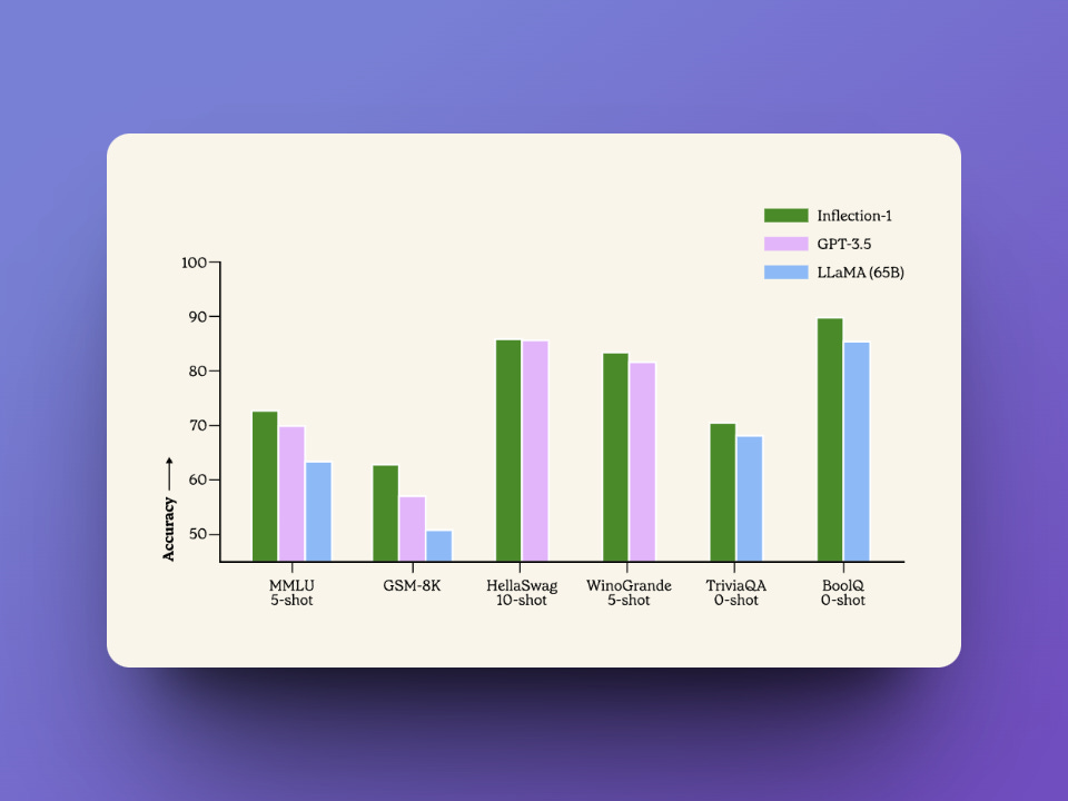 推出了 Pi 聊天机器人的 Inflection 宣布 Inflection-1 语言模型并将提供 API 服务,根据新闻稿,其性能优于 GPT-3.5、LLaMA、Chinchilla 和 PaLM-540B,与 PaLM-2 和 GPT-4 属于同一级别;
